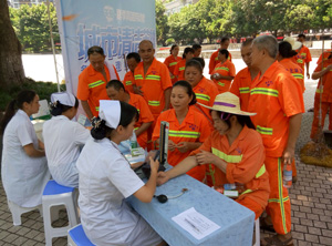 重庆迪邦皮肤病医院的爱心志愿者为环卫工人量血压